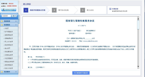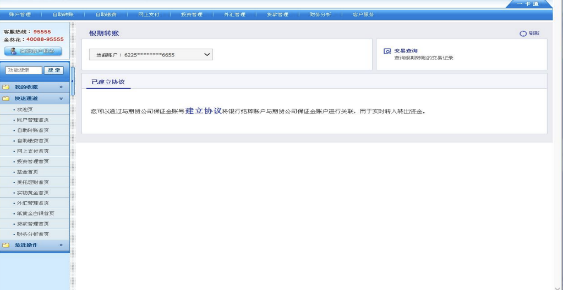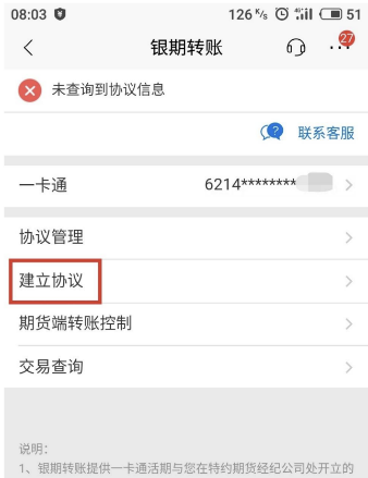 第二步:选择“一卡通”——“投资理财”——“银证期转账”——“银期转账”,点击“建立协议”;