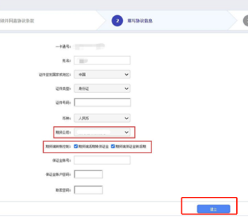 第三步:“开通协议”界面——期货端转账控制中,请务必勾选下方两项“期货端活期转保证金”及“期货端保证金转活期”,填写期货账号、期货资金密码、银行卡密码,阅读并勾选相关协议,点击“确认”后即可完成签约。