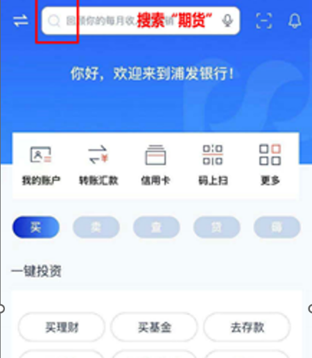 第一步:个人手机银行首页搜索栏输入“期货”——选择搜索结果 “证券期货”,或者点击“财富”——“ 更多”——“证券期货”;