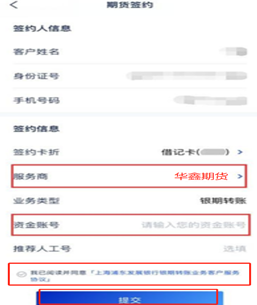 第三步:进入“签约/开户”界面,填写相关信息,输入“期货资金账号”,阅读并勾选相关协议,点击“提交”,根据提示输入“期货资金密码”及“银行密码”,点击“确认”完成签约。