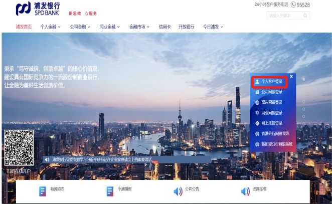 第一步:登陆浦发银行官网 https://www.spdb.com.cn/,选择”个人网银登录”。