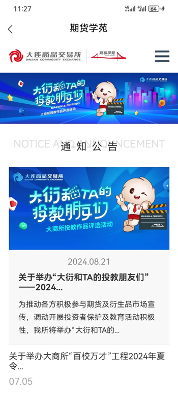 大商所对外门户提供了APP版期货学苑。投资者可以在移动设备上更加便捷地访问和学习期货相关知识。