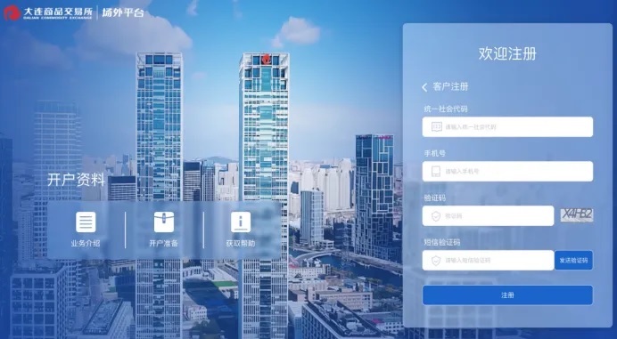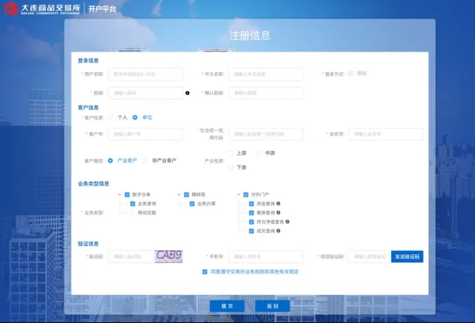 支持已在期货市场开户的客户注册登录,需填写用户名称、中文名称、密码等登录信息,填写客户号、社会统一信用代码等用于校验客户身份,填写会员号用于审批客户注册,选择业务类型用于开通业务权限,填写验证码、手机号、短信验证码用于安全校验。