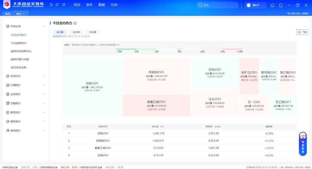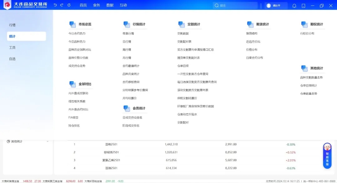 40余项特色统计指标;增长数据展示周期,拓展数据展示维度;实现数据客户分层,涵盖期货、期权、仓单、交割、会员、全球对比等。