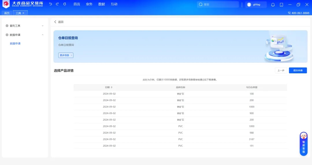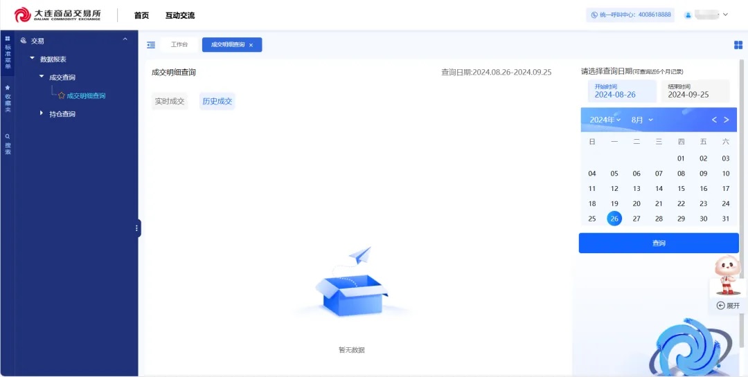 大商所对外门户还为客户提供交易数据查询服务,可实现会员、产业客户、仓库、客户的成交、持仓、套保、仓单等业务的一站式查询。