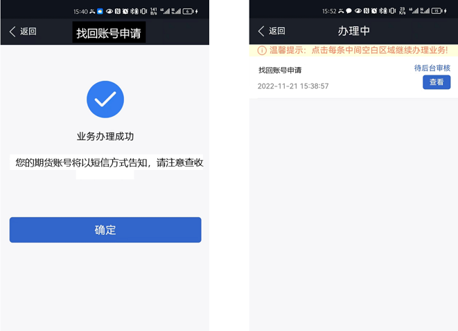 c.提交申请(待审核状态,可在我的业务——办理中查询,审核结果可在我的业务——已办理中查询,期货账号将以短信方式告知)