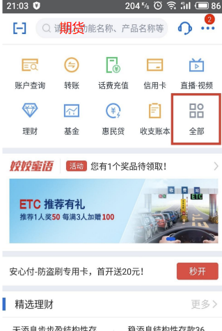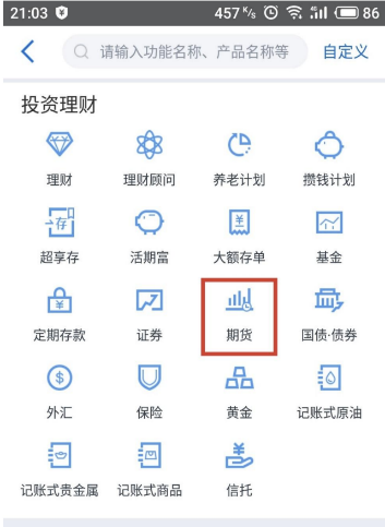 第一步:个人手机银行首页搜索栏输入“期货”——进入功能栏目下的“期货”,或者点击“全部——投资理财——期货”;