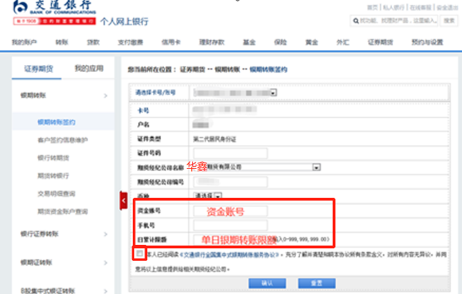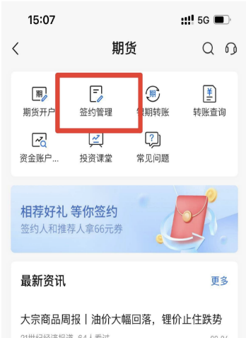 第二步:“期货”界面——签约管理——办理新的银期转账签约;
