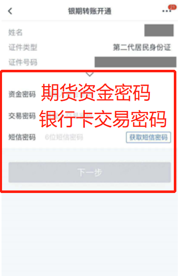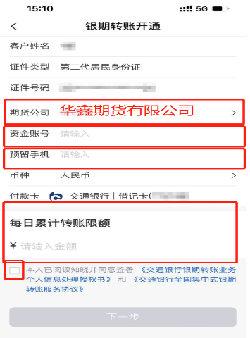 第三步:确认个人证件、银行卡信息、期货公司选择“华鑫期货有限公司”,输入“资金账号”、手机号、设置单日银转期限额、阅读并勾选相关协议,点击“下一步“完成验证后签约成功。