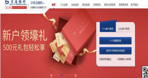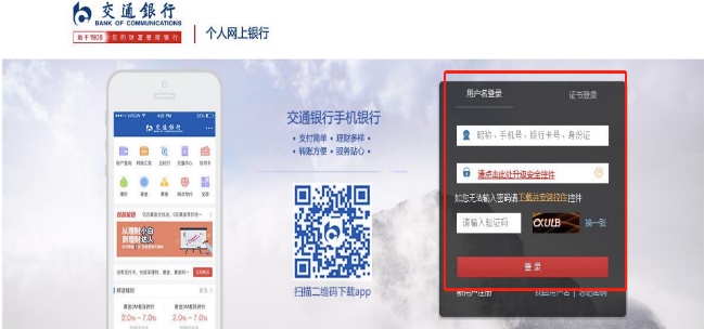 第一步:登陆交通银行官网 http://www.bankcomm.com,选择”个人网银登录”。