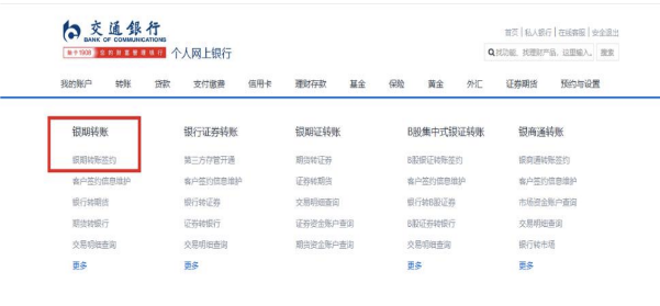 机构客户可登录网上银行进行银期签约,通过“配置服务-集中签约-银期转账签约”模块办理签约,开通银期转账业务完成银期签约(企业网银操作员需配置法人授权权限)。