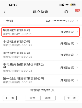 第二步:“银期转账”界面——建立协议——选择“华鑫期货有限公司”(第23页);