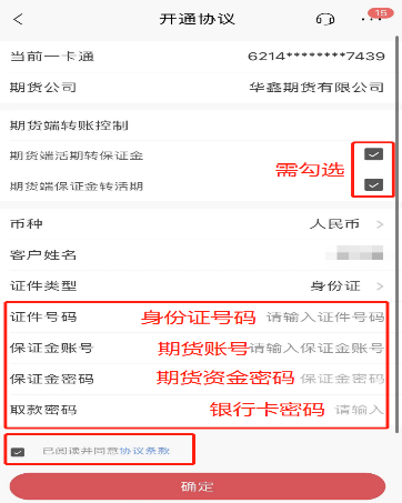第三步:“开通协议”界面——期货端转账控制中,请务必勾选下方两项“期货端活期转保证金”及“期货端保证金转活期”,填写期货账号、期货资金密码、银行卡密码,阅读并勾选相关协议,点击“确认”后即可完成签约。