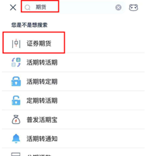第一步:个人手机银行首页搜索栏输入“期货”——选择搜索结果 “证券期货”,或者点击“财富”——“ 更多”——“证券期货”;