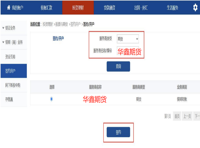 第二步:选择“投资理财”——“股票与期货”——“签约管理”,选择“华鑫期货”后点击“签约”;