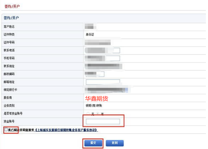第三步:进入“签约/开户”界面,填写相关信息,输入“期货资金账号”,阅读并勾选相关协议,点击“提交”,根据提示输入“期货资金密码”及“银行密码”,点击“确认”完成签约。