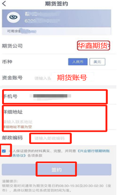 第三步:期货公司选择“华鑫期货”根据页面提示信息填写期货账号、手机号、地址、邮编等,阅读并勾选相关协议,点击“签约”完成验证后完成签约。