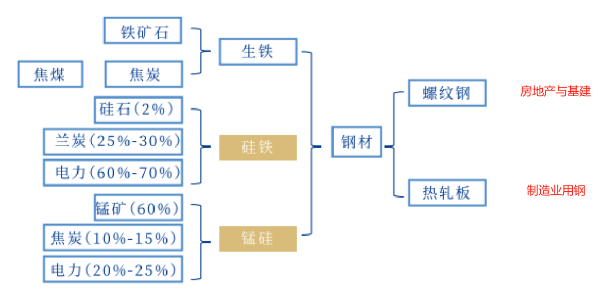 锰硅、硅铁是炼钢的添加剂,生产一吨粗钢大约消耗10千克锰硅和4千克硅铁。硅铁是铁单质和硅单质组成的合金,至少含有72%的硅元素;锰硅是锰单质与硅单质组成的合金,至少65%的锰元素,至少17%的硅元素。锰硅硅铁主要用于钢铁工业,作为炼钢时的脱氧剂、合金剂以及铸造的晶核孕育剂等,通常在电炉、转炉和精炼环节中添加。